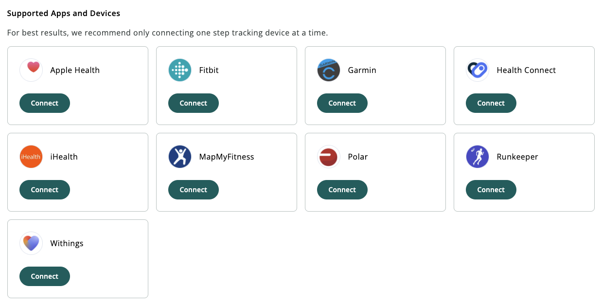 * Apple Health solo se puede añadir a través de la aplicación móvil de iOS. Visite Apple Health: cómo conectarse para obtener más información.